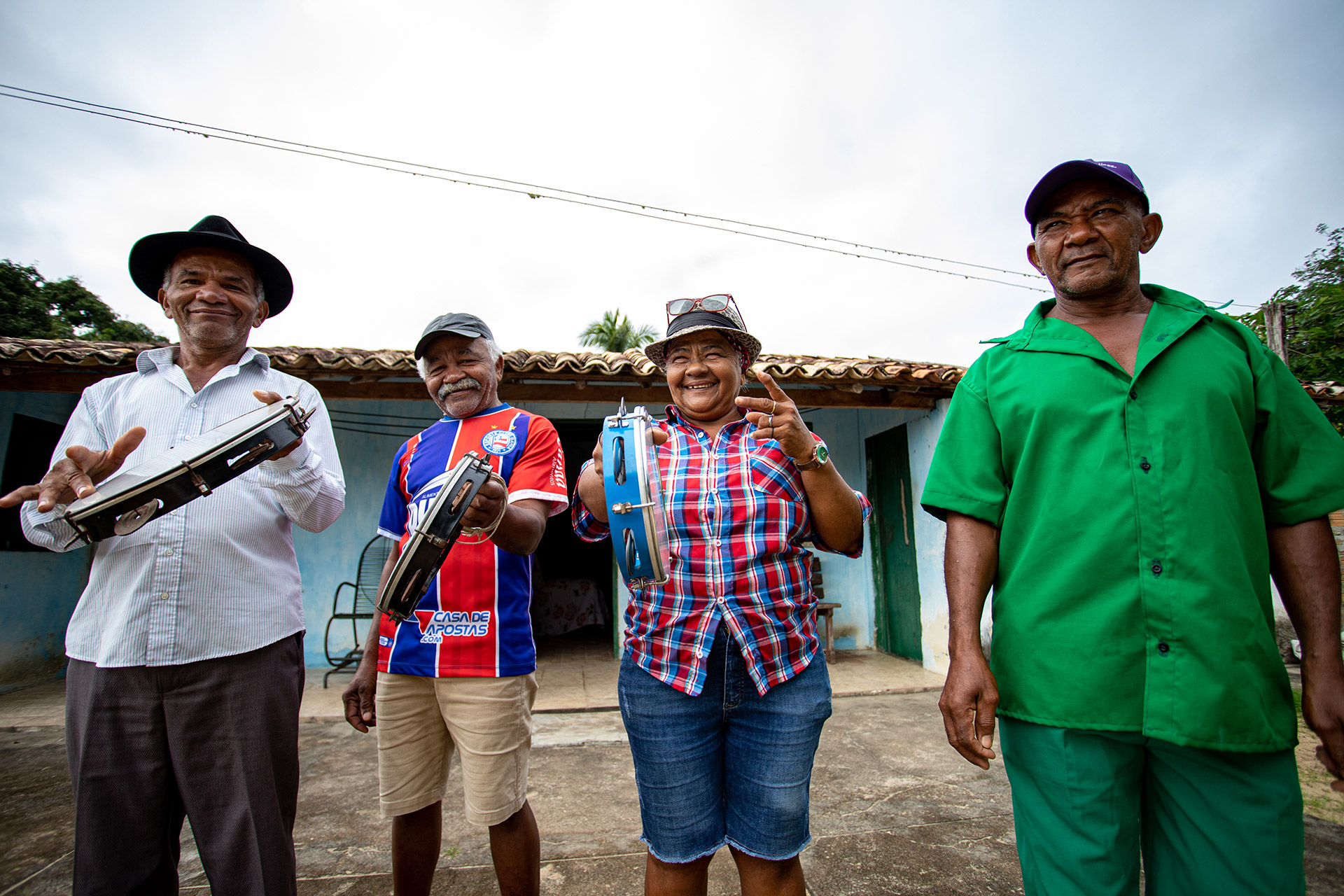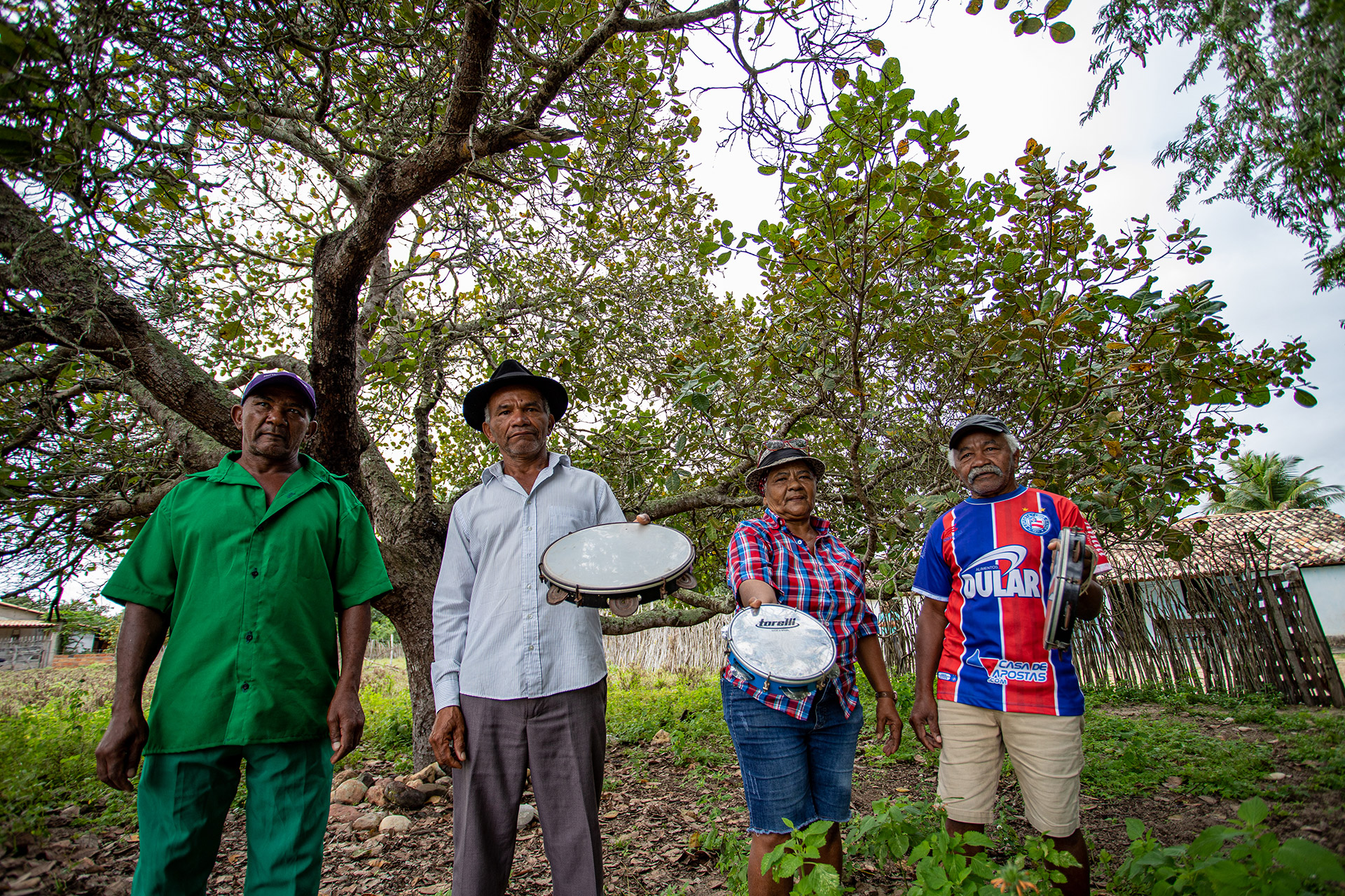 Descrição: Zabumbeiros tocando e filhos de santo da Ialorixá Durvalina dançando